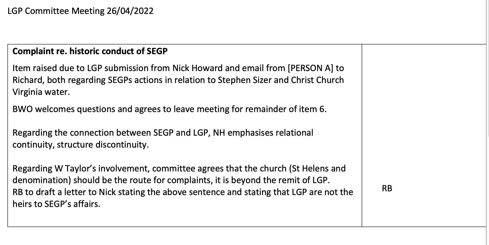 Importantly, the London Gospel Partnership – an organisation to which St Helen’s belongs – thought it was right to seek answers from St Helen’s. Committee minutes obtained via Subject Access Request identify St Helen’s as a proper “route for complaints” about Taylor’s handling of the Sizer case. The LGP Committee’s opinion shows it was reasonable to expect St Helen’s to address the complaint. St Helen’s is, therefore, objectively failing to meet evangelical norms.